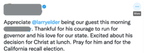 I harken back to a Twitter post by a prominent Bible-believing Pastor who declared that he was excited about Larry Elder’s decision for Christ. Though repeatedly asked for clarification of his vague comment, he has yet to give any public answer clarifying his public declaration. To me, this is the epitome of conflating Christianity with conservatism. While I understand that both conservatives and Christians in California would prefer Larry Elder over Gavin Newsom for governor, a line is crossed when pastors pussyfoot around with politicians, cede the pulpits to them, and then declare to the world some vague undefined decision for Christ.